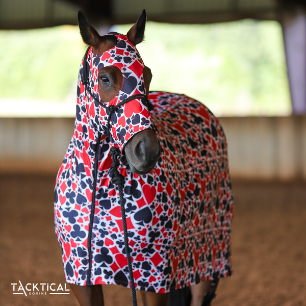 Introducing the Tacktical Full Body lycra equine bodysuit, offering complete head-to-tail coverage for your horse, resulting in a sleek coat and remarkable shine. Featuring a convenient zippered opening from the chin groove to the chest for effortless dressing, and durable hind leg straps made from nylon webbing with sturdy nylon fittings.