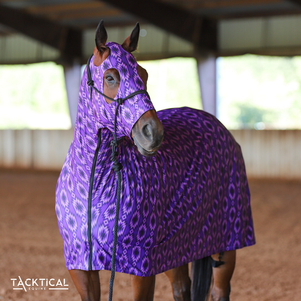 Introducing the Tacktical Full Body lycra equine bodysuit, offering complete head-to-tail coverage for your horse, resulting in a sleek coat and remarkable shine. Featuring a convenient zippered opening from the chin groove to the chest for effortless dressing, and durable hind leg straps made from nylon webbing with sturdy nylon fittings.